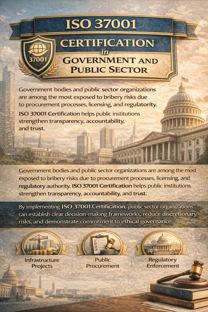 Government bodies and public sector organizations are among the most exposed to bribery risks due to procurement processes, licensing, and regulatory authority. iso 37001 Certification helps public institutions strengthen transparency, accountability, and trust.